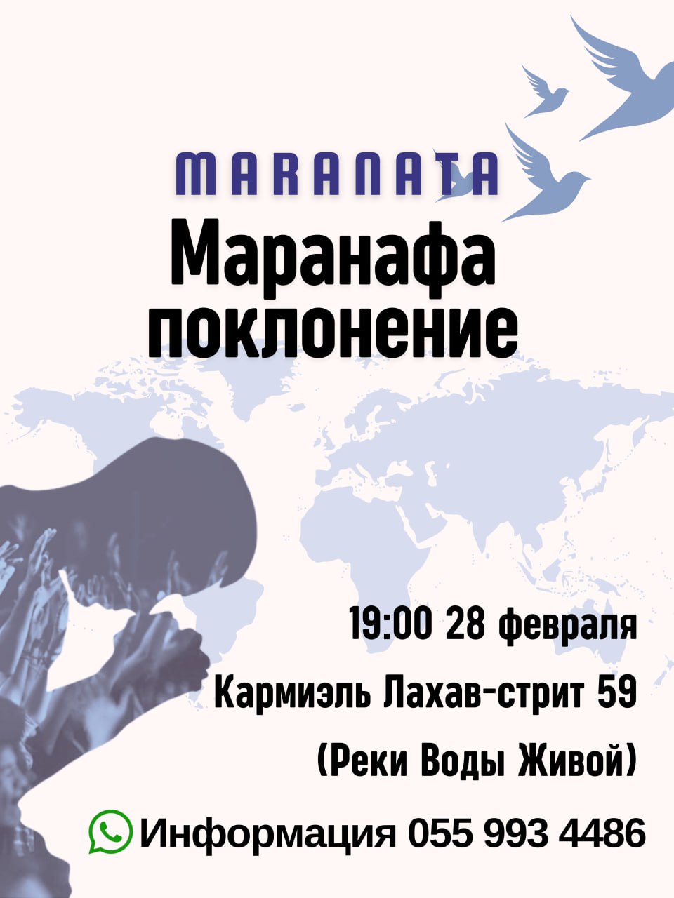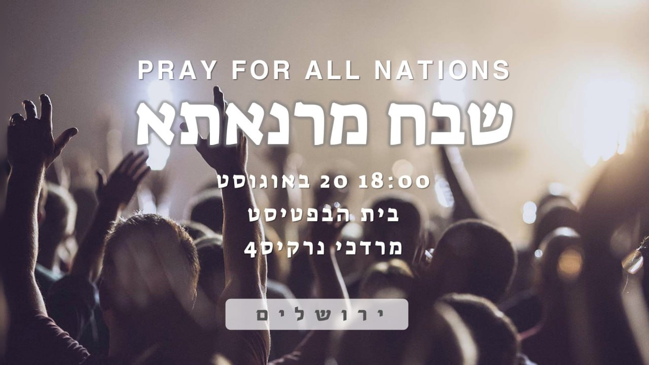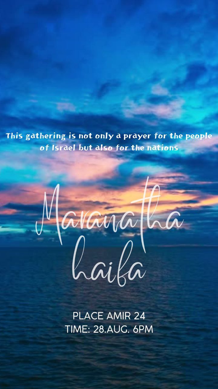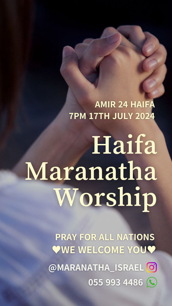 이를 위해 저희 마라나타 워십은 예루살렘, 하이파 그리고 나사렛에서 한달에 한번 모든 이스라엘의 교회들과 성도들을 초대하여 예배를 드립니다. 이 모임은 이스라엘 민족만을 위해 기도하는 것이 아닌 온 열방을 위해 기도하는 예배입니다. 세계 선교지에서 사역하는 선교사님들을 통해 터키, 이란, 모로코 등등 여러 미전도 종족의 소식을 듣고 그 민족들을 위해 중보합니다. 또한 열방에 복음을 전하고 싶어하는 믿음의 일꾼들을 파송합니다.