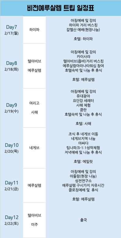 비전 예루살렘 트립은 성경의 배경이 되는 이 땅을 밟으며 성경의 말씀이 생생하게 역사하는것을 경험할수 있습니다.